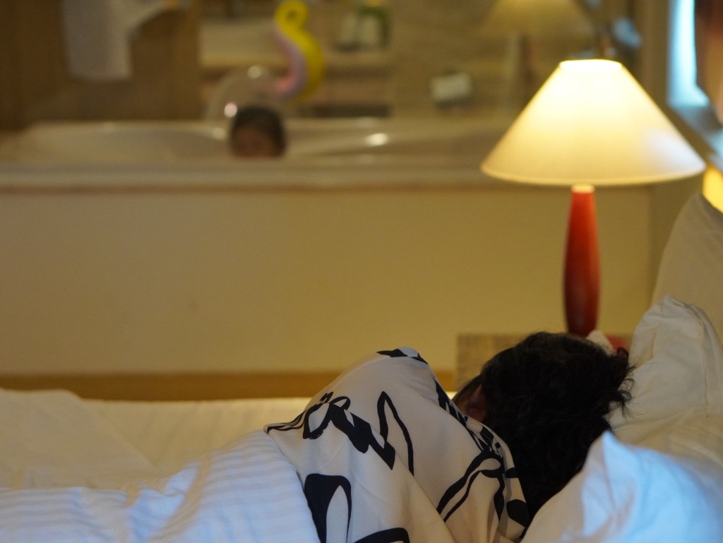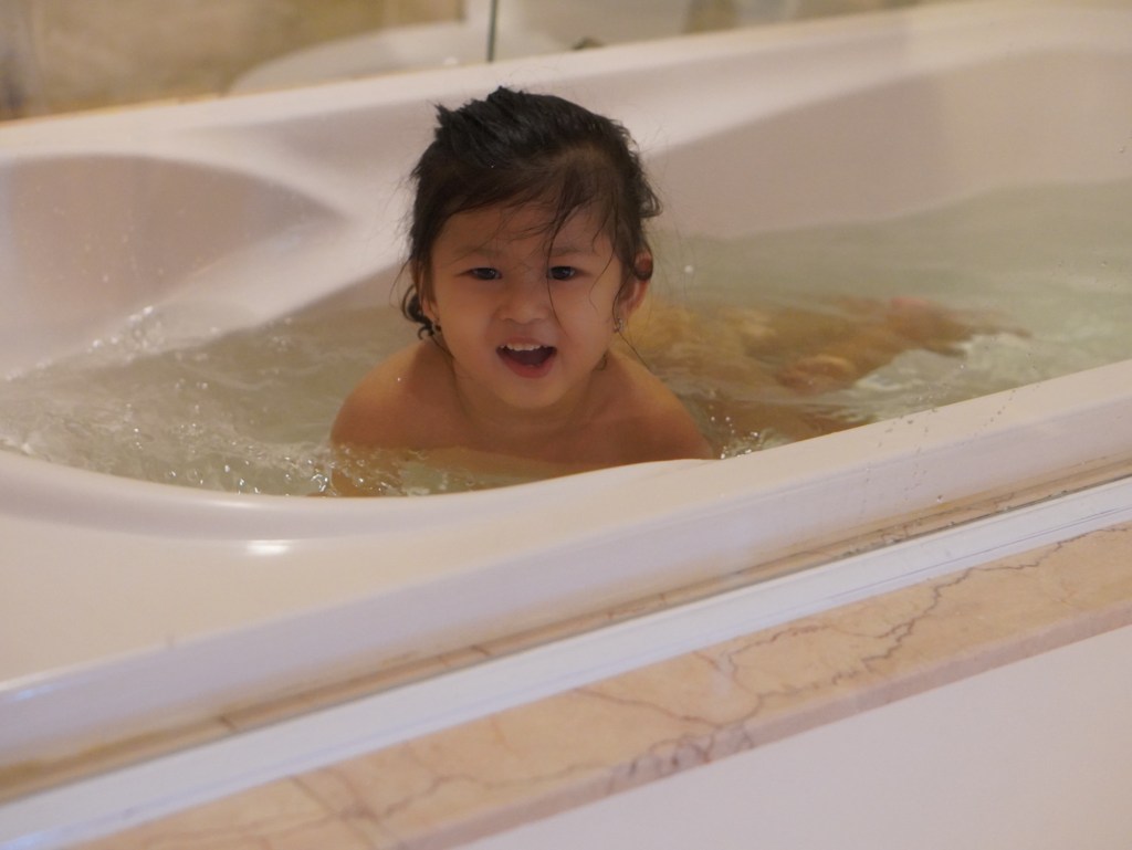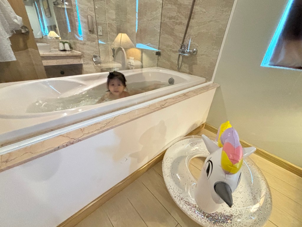 Bên trong phòng có em bé ngụp lặn trong bồn tắm trong suốt mình vừa nằm nghỉ ngơi vừa canh bé – Điểm cộng cho Mường Thanh.
