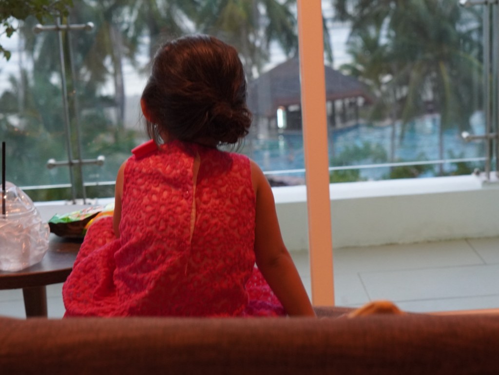 Vì không có chỗ chơi nên em bé chơi trên phòng ngắm biển từ xa.