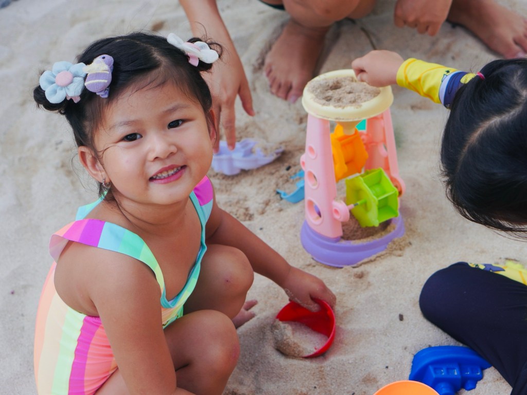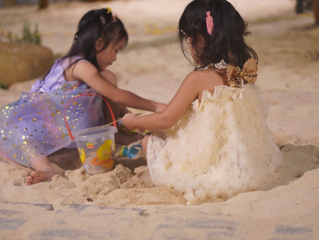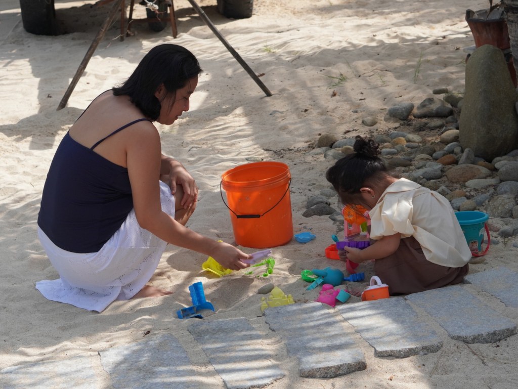 Em Bơ nhà mình đi về mà vẫn còn đòi quay lại chơi cát với chị Su và em Shi.