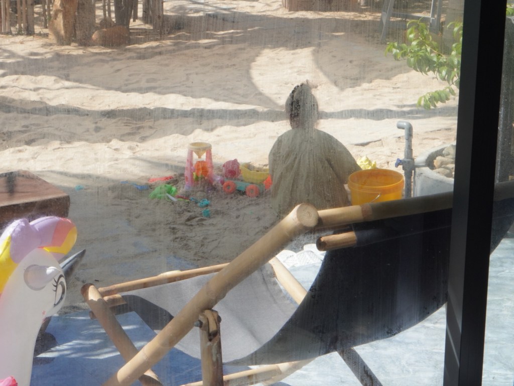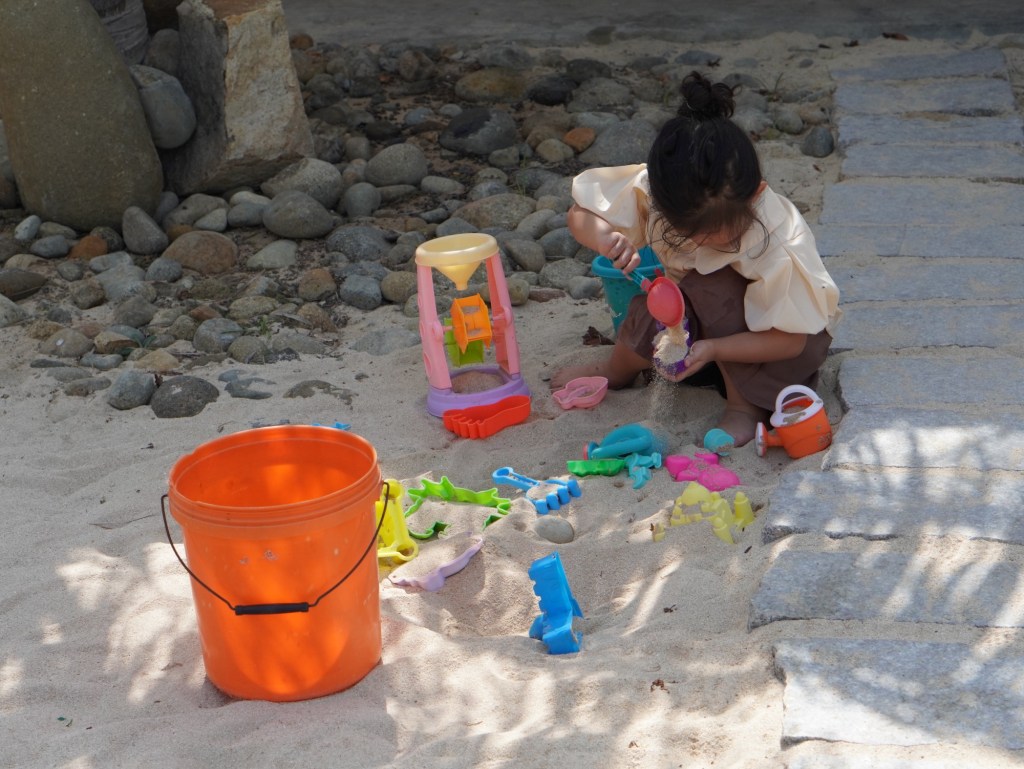Em Bơ chơi cát trước phòng mình ở luôn,home có nhiều đồ chơi cát có sẵn cho bé. Tụi mình nằm trong phòng ngắm con chơi cát thôi cũng thấy vui.