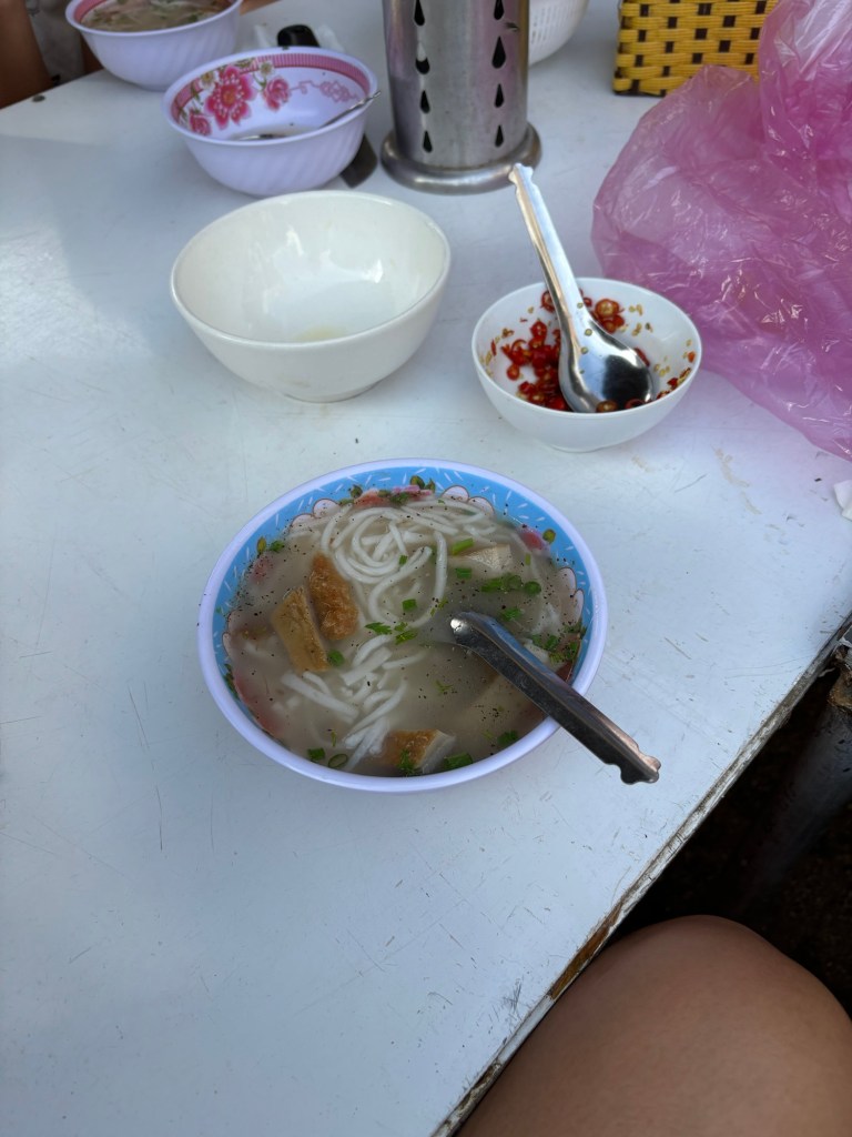 Ăn sáng có trứng và mì gói để sẵn khách tự nấu hoặc đi ra chợ gần đó ăn bánh canh 15k như mình cũng ngon xỉu.