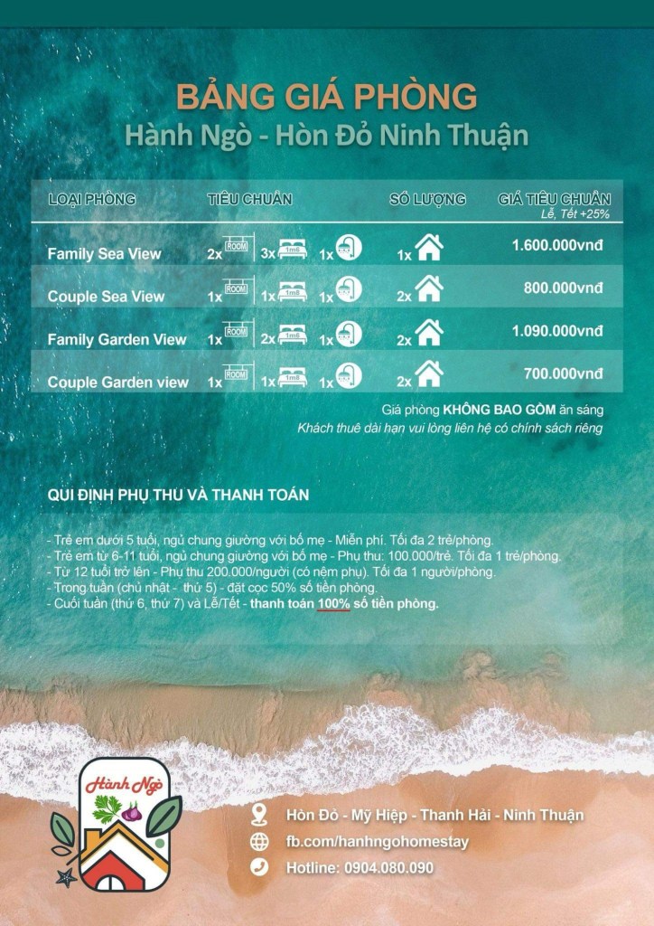 Giá phòng dao động: 700,000 VND – 800,000 VND cho 2 người. Có phòng lớn cho đại gia đình ở được 6-8 người 1,600,000 VND.