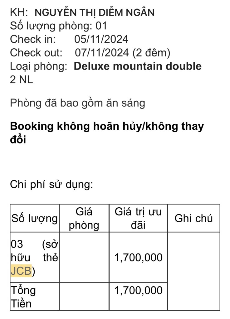 Mình đặt phòng qua hệ thống thẻ JCU của BIDV giá và loại phòng như bên dưới.