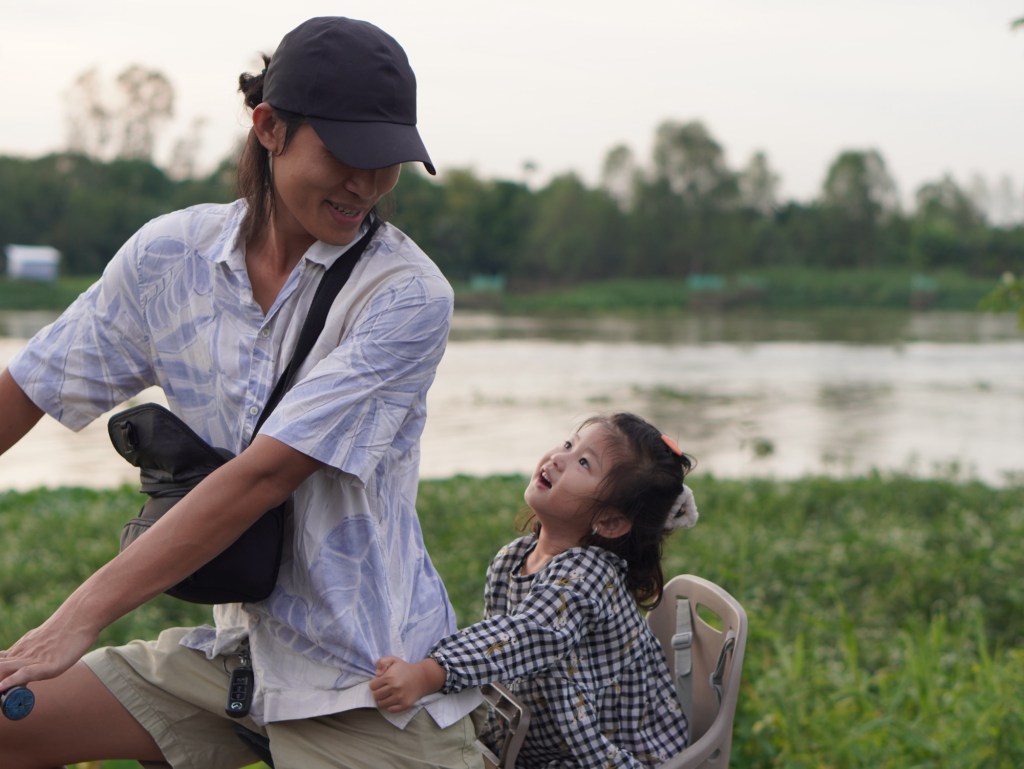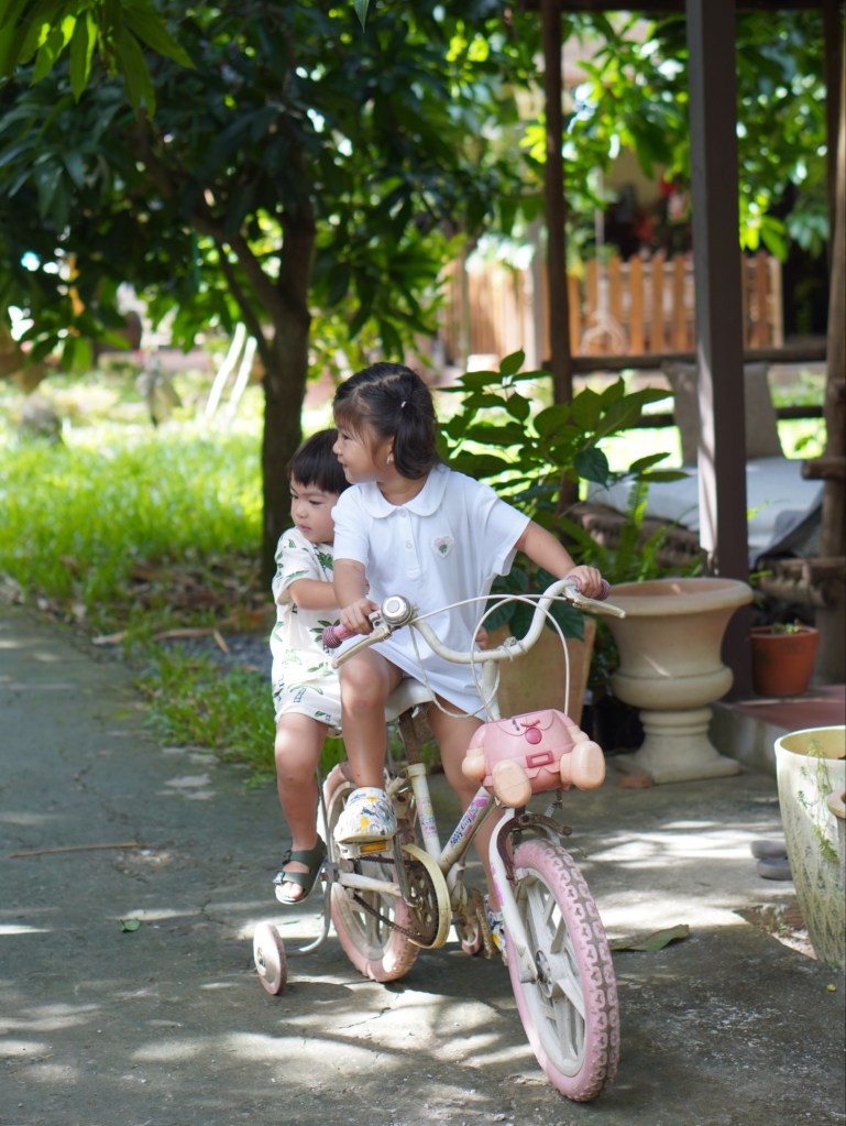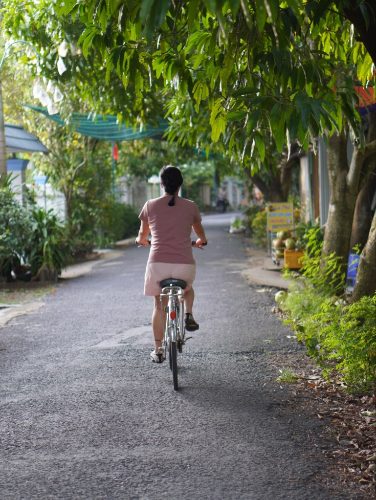 Buổi chiều gia đình mình đạp xe đạp quanh xóm cũng thú vị và mát mẻ, xoài ở đây trồng cả ra ngoài đường xanh mướt mắt. Xe đạp miễn phí ai thích thì lấy đạp.