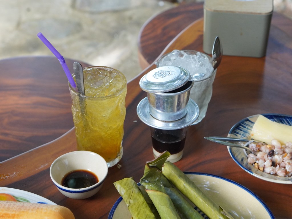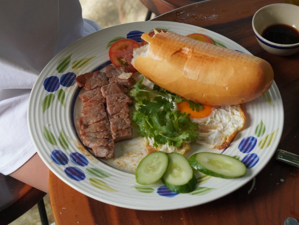 Đồ ăn sáng gồm ốp la và bò beefsteak, bánh quê và cà phê sữa ăn khá vừa miệng và no.