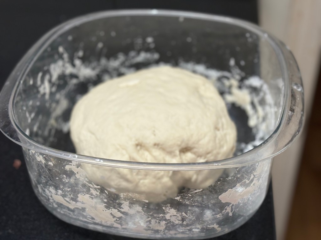 - Nhào bột: Trộn bột mì, muối, men, thêm nước và dầu ô liu, nhào đến khi mịn.
