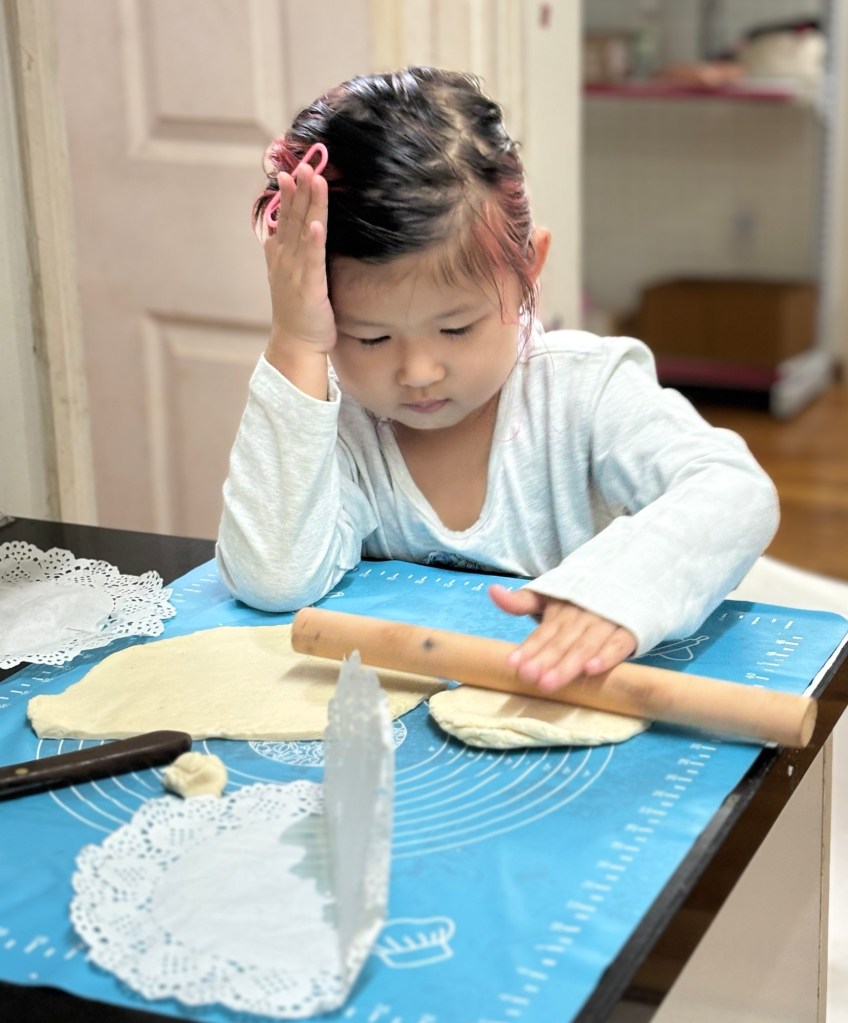 - Chia và cán bột: Chia bột thành 4-5 phần, cán mỏng 0.5cm.